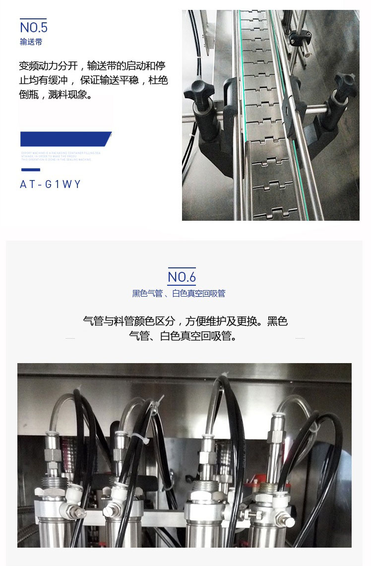該六頭柱塞式全自動潤滑油灌裝機(jī)特的灌裝頭設(shè)計(jì)及真空回吸系統(tǒng),確保灌裝過程無殘油滴漏,快慢雙速灌裝,灌裝速度可調(diào),杜絕溢瓶現(xiàn)象。該機(jī)采用動力灌裝,無需配裝高位罐,簡化了安裝工序,提高了灌裝效率。履帶式壓蓋機(jī),穩(wěn)定無噪音,無空壓現(xiàn)象。觸摸屏界面友好,操作簡捷,SIEMENS PLC控制系統(tǒng),運(yùn)算速度快,性能穩(wěn)定,品質(zhì)卓越。電、氣件均采用精品元件,確保整機(jī)運(yùn)作穩(wěn)定。