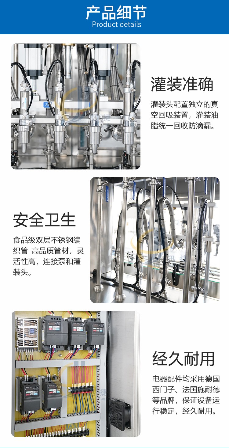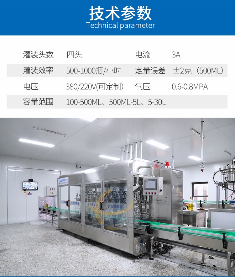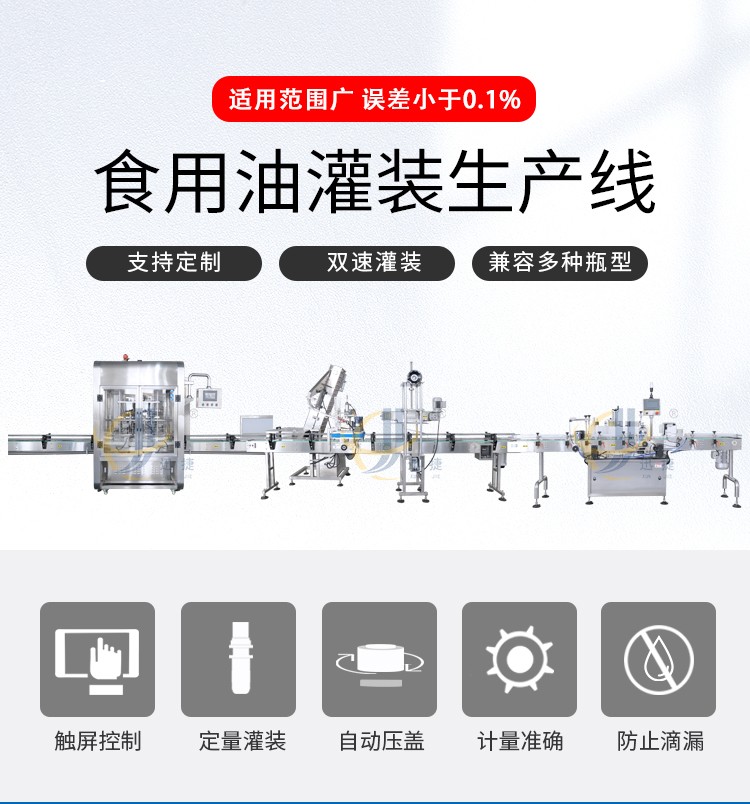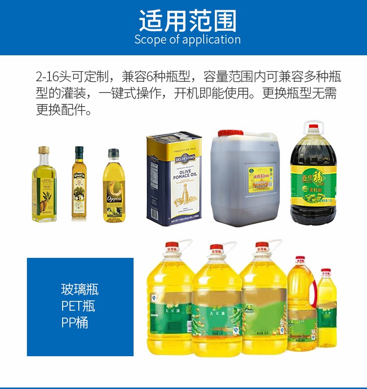食用油灌裝生產(chǎn)線2-16頭可定制,兼容6種瓶型,容量范圍內(nèi)可兼容多種瓶型的灌裝,一鍵式操作,開機即能使用。
